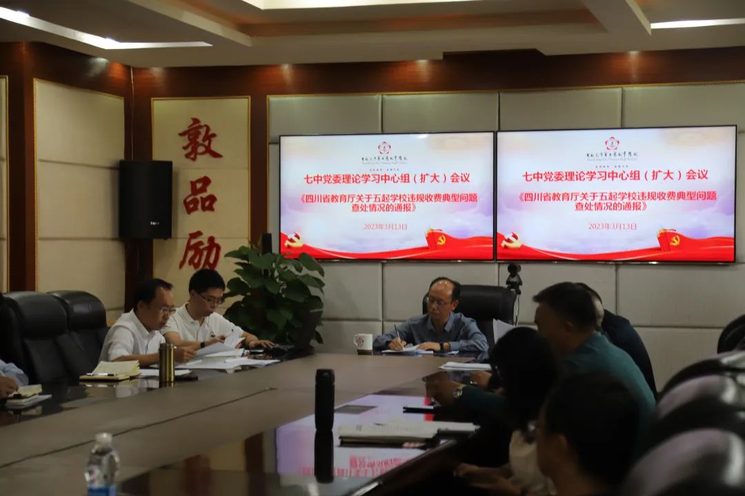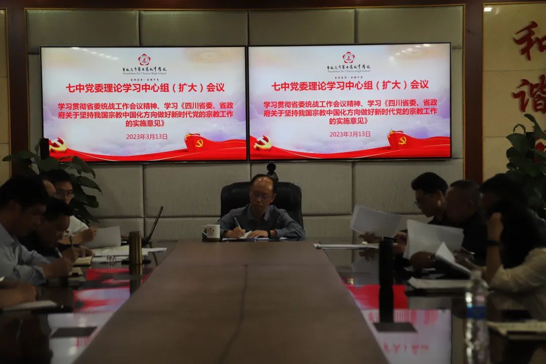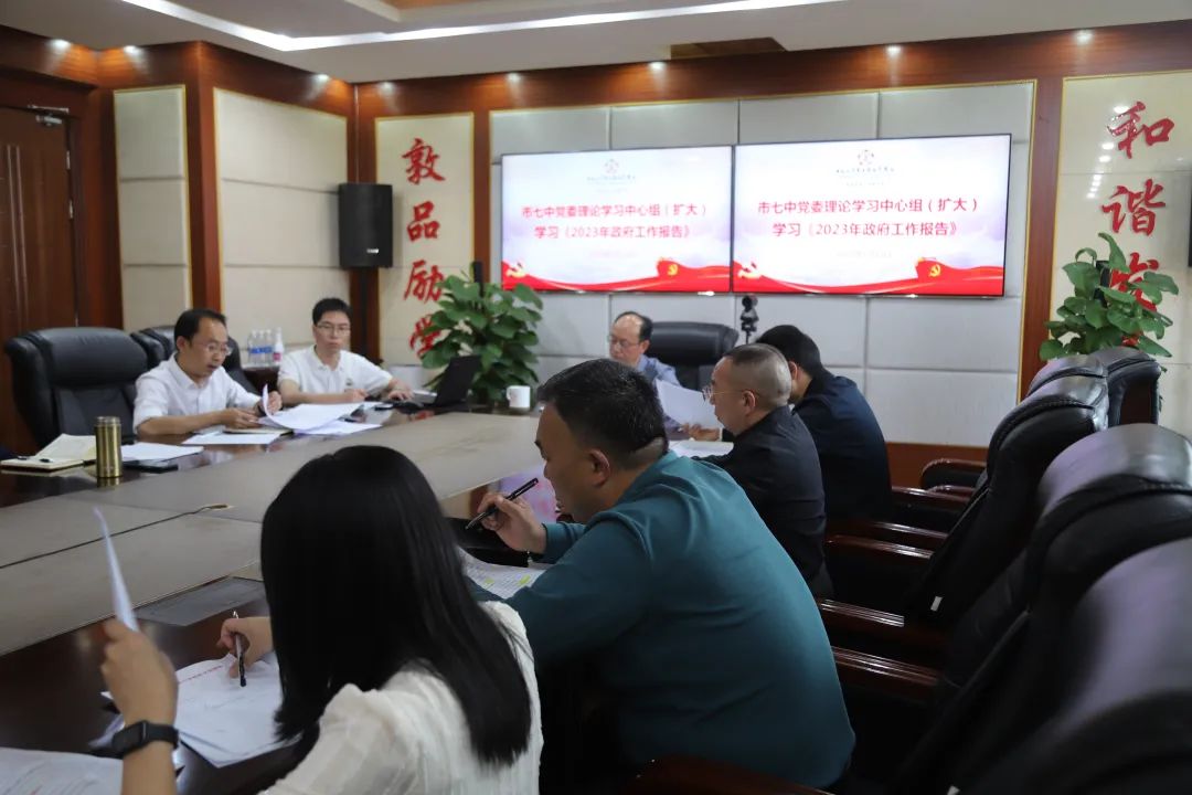 2023年3月13日下午,市七中党委在西城校区博通楼四楼会议室召开理论学习中心组扩大会议,专题学习2023年全国“两会”上的《政府工作报告》。会议由学校党委书记杨鸿同志主持,班子成员及全体中层干部参加。