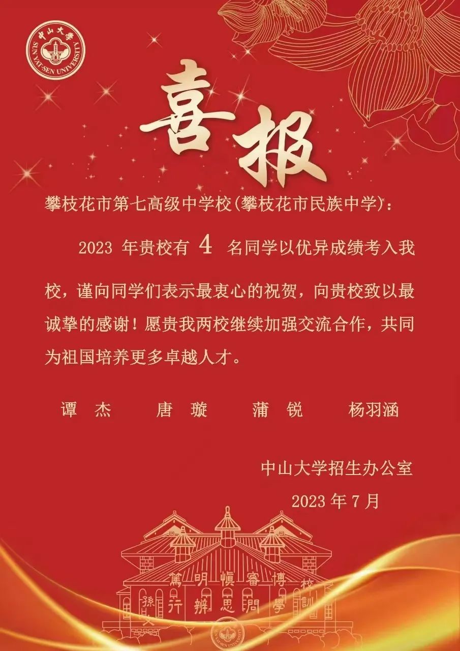 中山大学发来喜报,攀枝花七中4名同学被中山大学录取!
