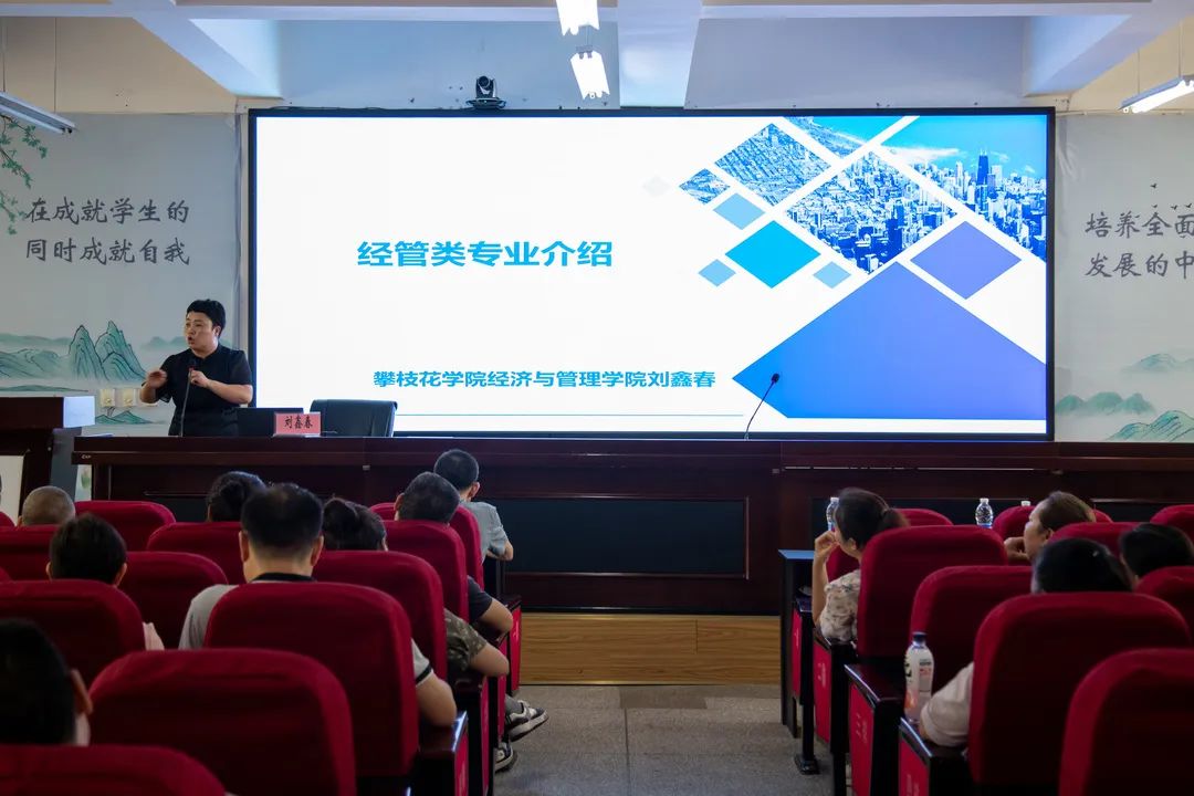市七中家委会成员,攀枝花学院教授、硕士研究生,攀枝花学院财务管理专业教师,专业建设负责人刘鑫春围绕经管类专业进行职业生涯规划指导。刘教授结合霍兰德职业兴趣理论强调了选择的重要性,并就经管类专业课程设置、就业方向、选科要求等进行了全面介绍,同时就志愿填报中如何选择高校与专业、了解专业排名、专业招生计划以及心态等对家长们进行了专业指导。